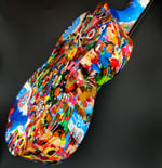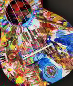 An original abstract painted ukulele, acrylic paint and cold wax onto found object. A tribute the fabled "Cosmic Guitar" that lived in Glyn Dillon's house, in Worthing, in the early 1990s.
