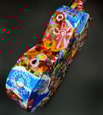A working Soprano Ukulele, painted in "Cosmic" colours by Tank Girl co-creator Alan C. Martin. 53cm high, 16cm wide, 6cm deep. The instrument has been stripped of its furniture, sanded, painted all over (apart from fretboard) with acrylic paint, sealed and buffed with cold wax, and then re-assembled. Signed "ACM 2025" on the back.