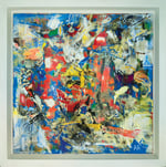 An original abstract painting, acrylic paint and cold wax onto a 250mm x 250mm wooden panel, mounted onto a 300mm x 300mm wooden frame. An over-all depth of 25mm.